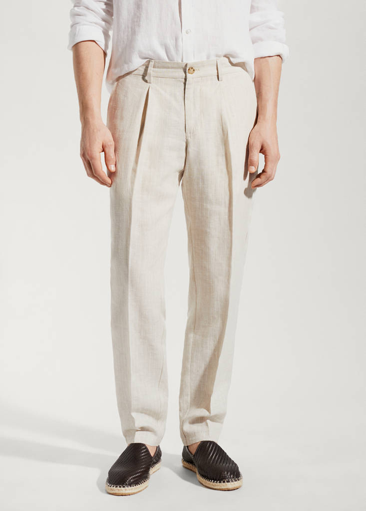 Slim fit. Mješavina lana i pamuka. Print tankih prugica. Dvostruko kopčanje gumbima i patentnim zatvaračem. Remen s omčama. Dva prednja džepa. Strelica sprijeda. Dva stražnja džepa s obrubom i gumbom. Stezanje na leđima. Ravna rub. Model je visok 187 cm i nosi veličinu 42