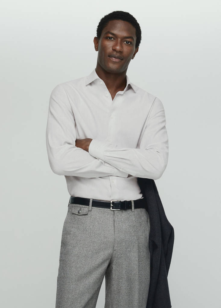 100% Pamuk. Slim fit. Strukturirana tkanina. Rašireni ovratnik. Dugi rukav s gumbima na manžetama. Prednje kopčanje s gumbima. Zaobljeni rub