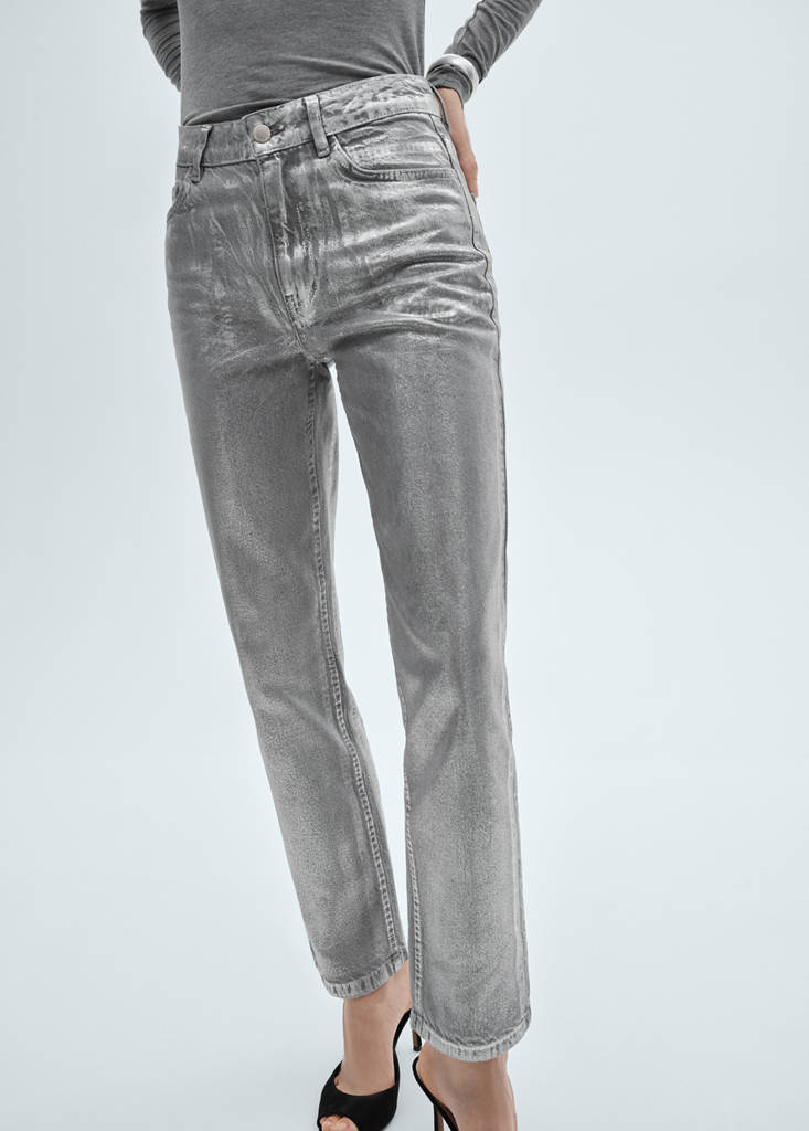 Pamučna tkanina u stilu traperica kaubojskog stila. Metalik. Ravni dizajn. Visoki struk. Pojasevi za remen. Pet džepova. Zatvarač i gumb. Unutarnji šav 74 cm. Kolekcija za zabave, ceremonije i pričesti