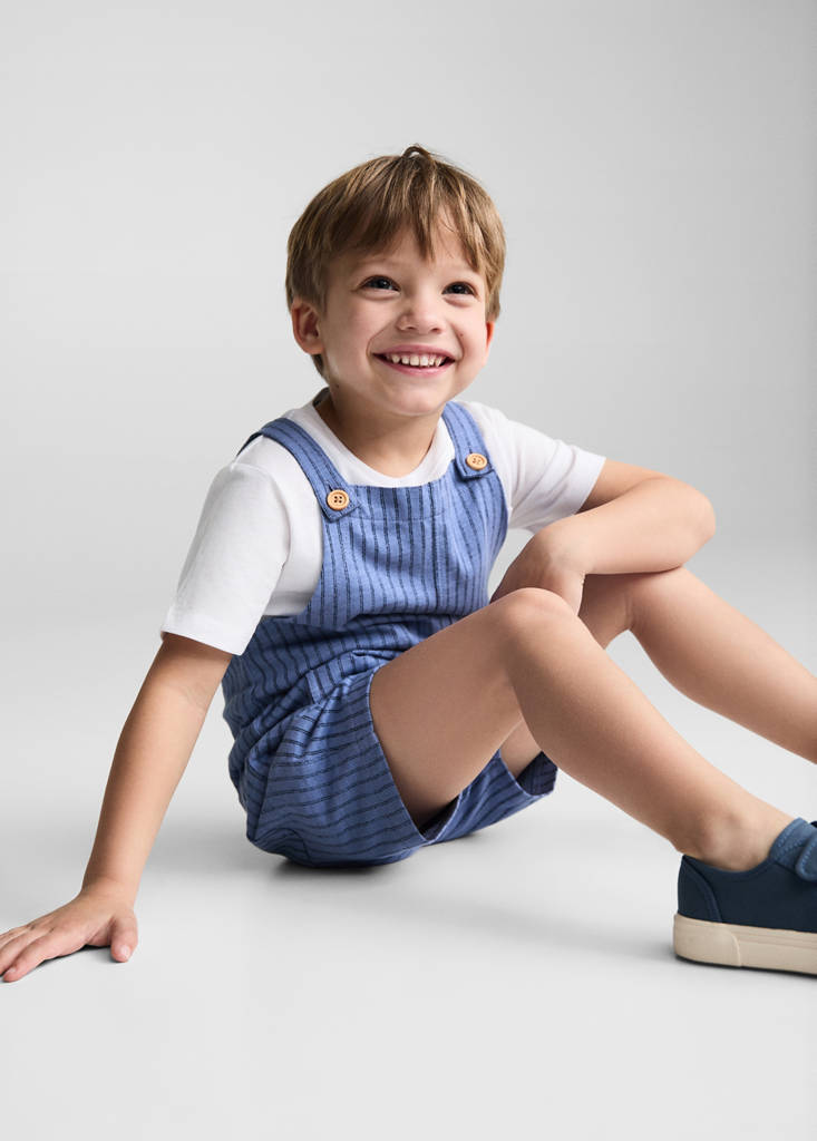 Striped print. Straight design. Short design. Two front pockets. Round neck. Sleeveless. Back patch pocket. Button up