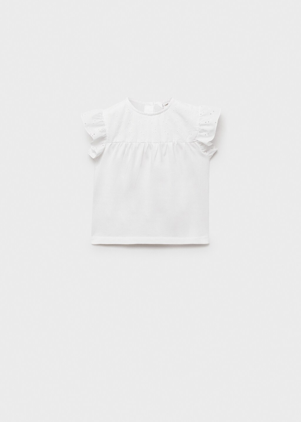 100% cotton fabric. Straight design. Round neck. Short-sleeved ruffle. Button fastening on the back section. Openwork details.