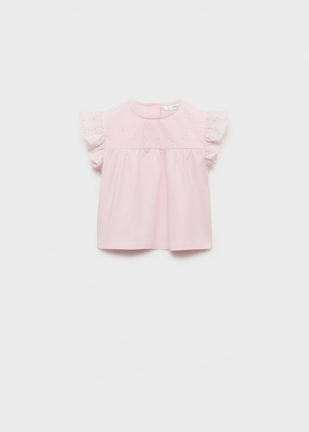 100% cotton fabric. Straight design. Round neck. Short-sleeved ruffle. Button fastening on the back section. Openwork details.