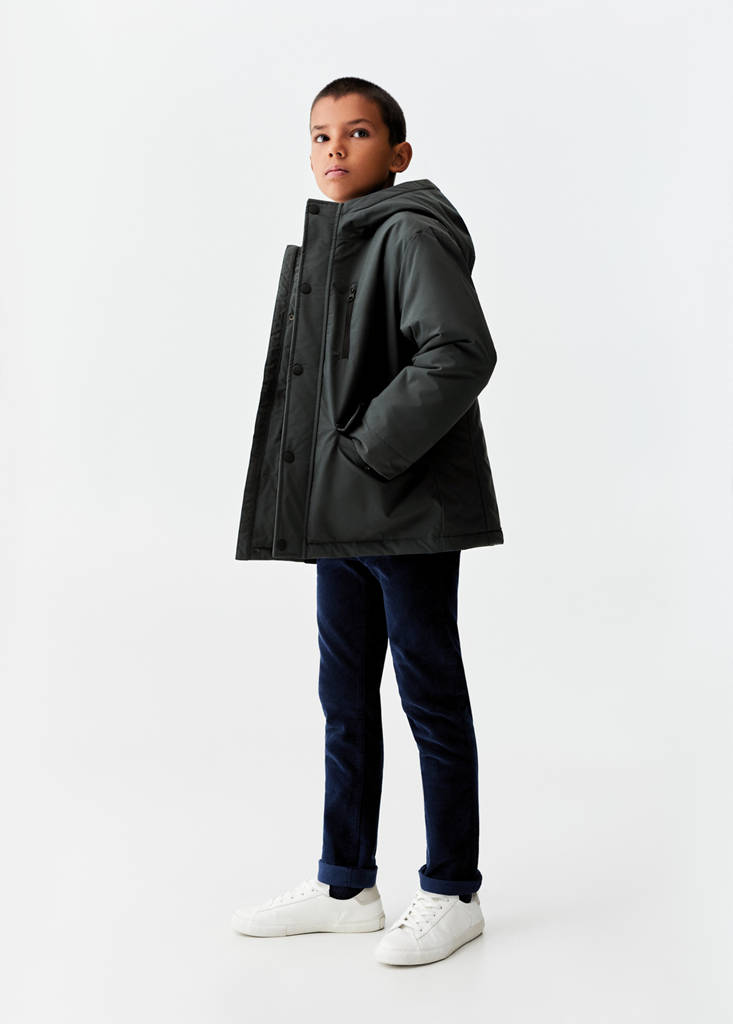 Basics Collection. With filling. Straight design. Hood. Long sleeves. Button up. Two pockets with flaps. Inner lining. Back to school