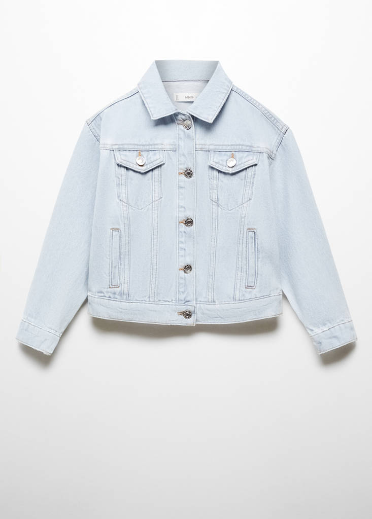 Denim-style cotton fabric. Short design. Straight design. Two-buttoned flap chest pockets. Long sleeves with buttoned cuffs. Classic collar. Front closure with buttons