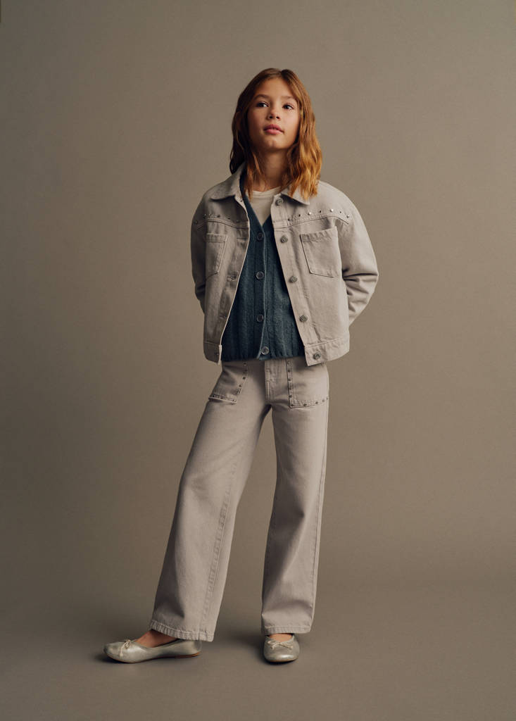 Denim-style cotton fabric. High waist. Two front pockets. Two patch pockets at the back. Front zipper and button closure. Stud detail