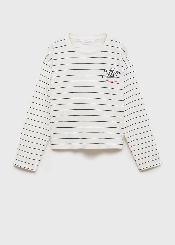 Flat structure Lightweight. 100% Cotton. Straight design. Striped design. Message printed on the front. Printed message on the back. Round neck with ribbed finish