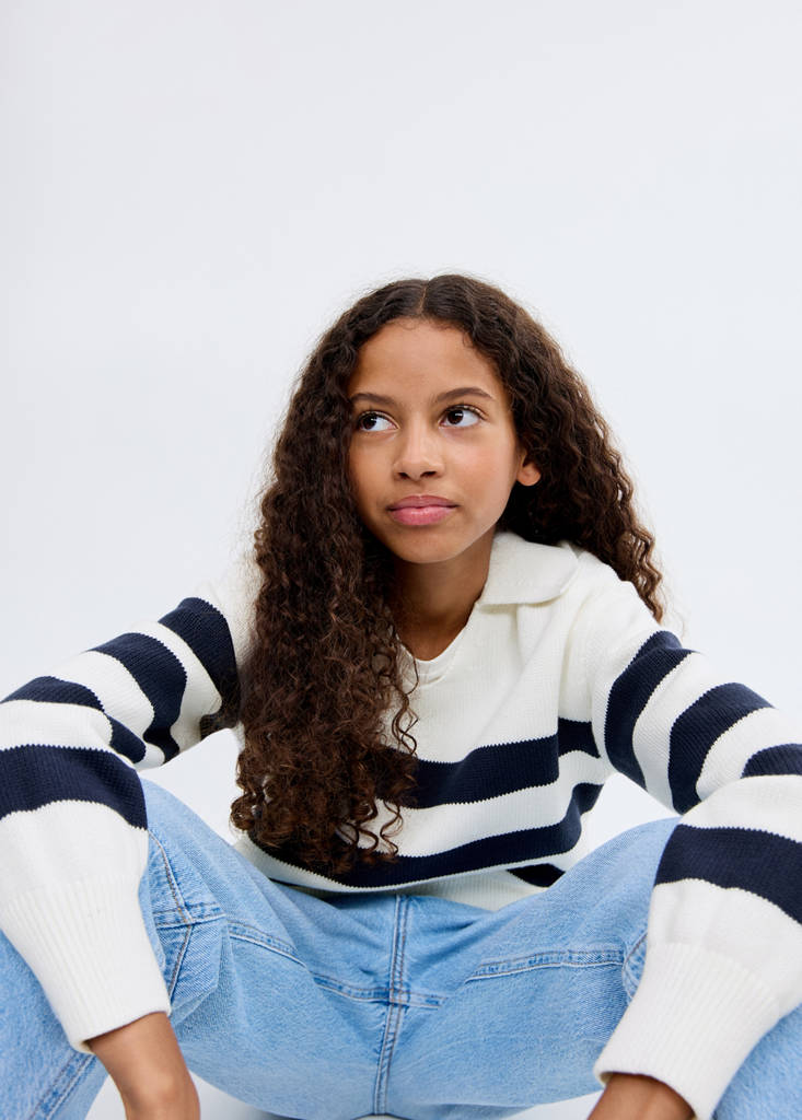 Knitted fabric. Striped fabric. Straight Design. Polo collar. Long sleeves. Ribbed collar, cuffs and hem