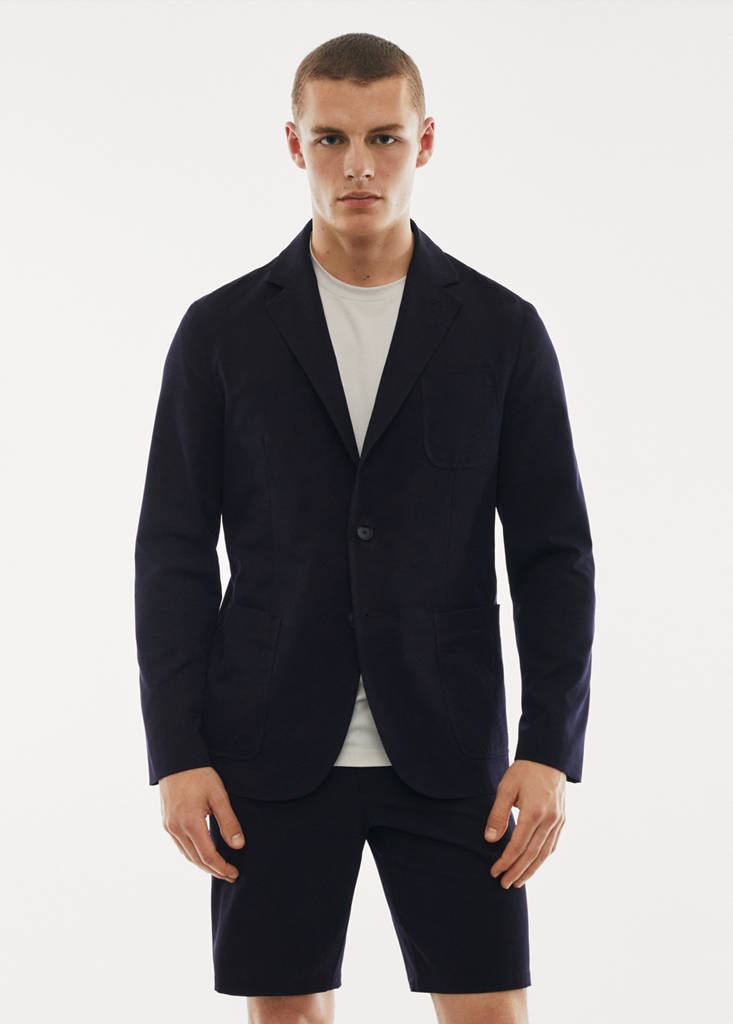 Performance Collection. Slim fit. Lightweight fabric. Waterproof fabric. 4 Way Stretch fabric. Machine or hand washable. Standard design. Notch lapels and buttonhole. Button fastening at the front. Two patch pockets at the front. Patch pocket on the chest. Long sleeves. Back slit detail. Straight hem. Without inner lining. Set Available. Water-repellent: The durable finish of this garment protects against light rain, repelling contact with water and raindrops