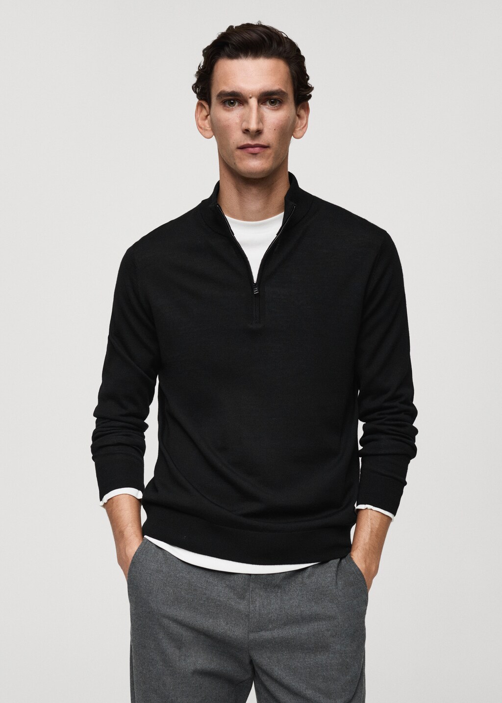ESSENTIALS: Made to last. The beige colour is an online exclusive. 100% merino wool. Machine washable. Fine-knit fabric. Perkins collar with zip closure. Cable knit finish. 100% wool. The green and camel models are online exclusives. Medium-knit fabric. Long sleeves with elastic cuffs. Regular fit. Untrimmed hem.