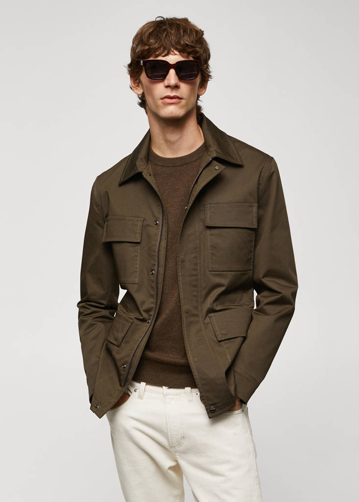 Slightly elastic cotton fabric. Short design. Regular fit. Field jacket. Heavy structure. Shirt collar. Two patch pockets with flaps on the chest. Two patch and flap pockets on the hip. Front zip and snap button closure. Inner lining. Interior pocket