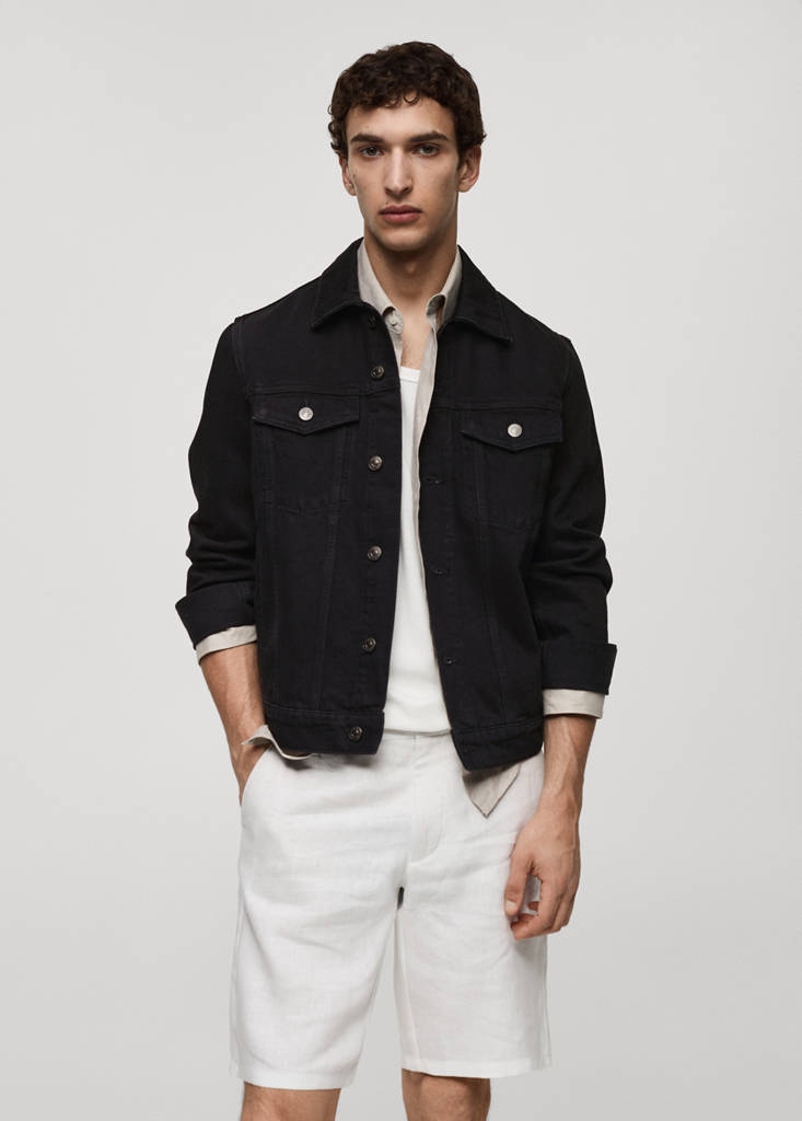 ESSENTIALS: Made to last. Denim jeans style. Short design. Long sleeves with buttoned cuffs. Twin buttoned flap pockets at front. Two side pockets. Adjustable waistband with straps and buttons on both sides of the hips. Front closure with buttons. Classic collar. 100% cotton fabric