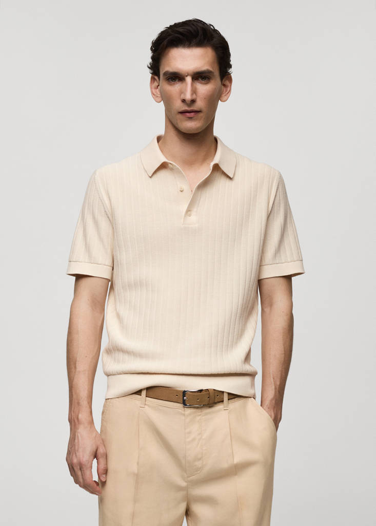 Fine knit fabric. Fabric with microstructure. Polo-neck with button closure. Short sleeves. Elastic hem. 100% cotton fabric. Untrimmed hem
