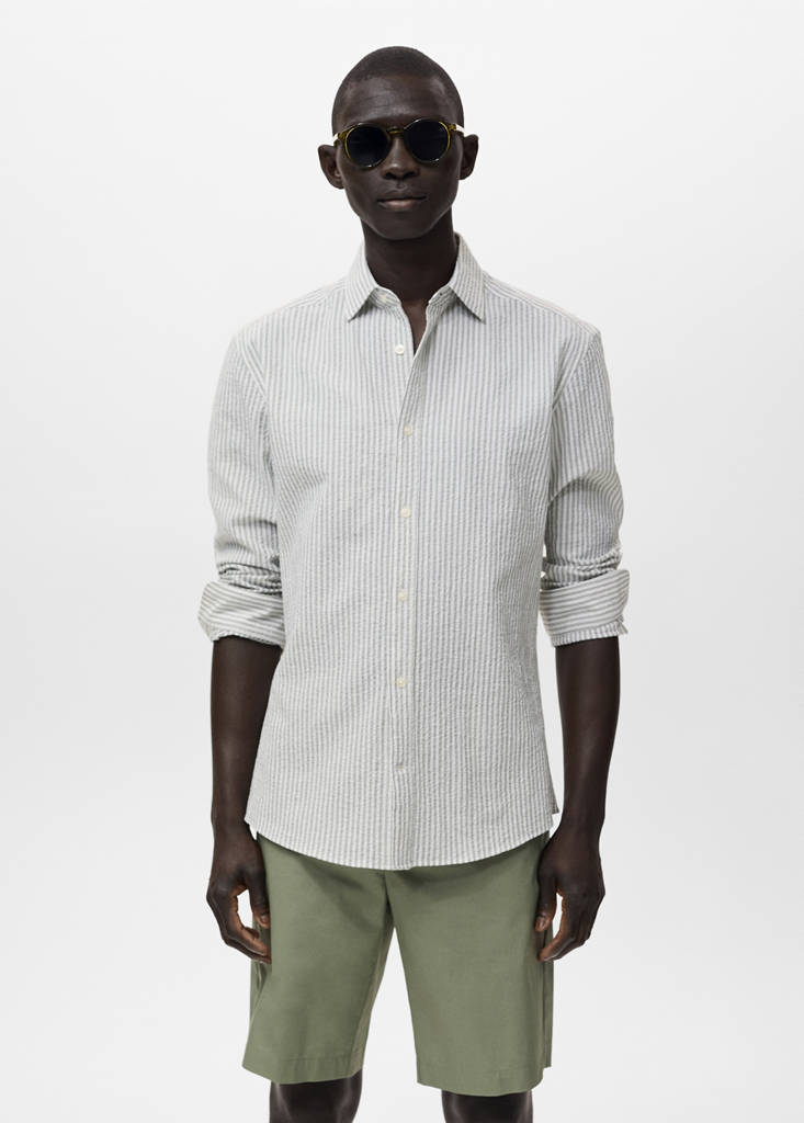 Cotton fabric. Regular fit. Striped print. Shirt collar. Long sleeves with buttoned cuffs. Front closure with buttons