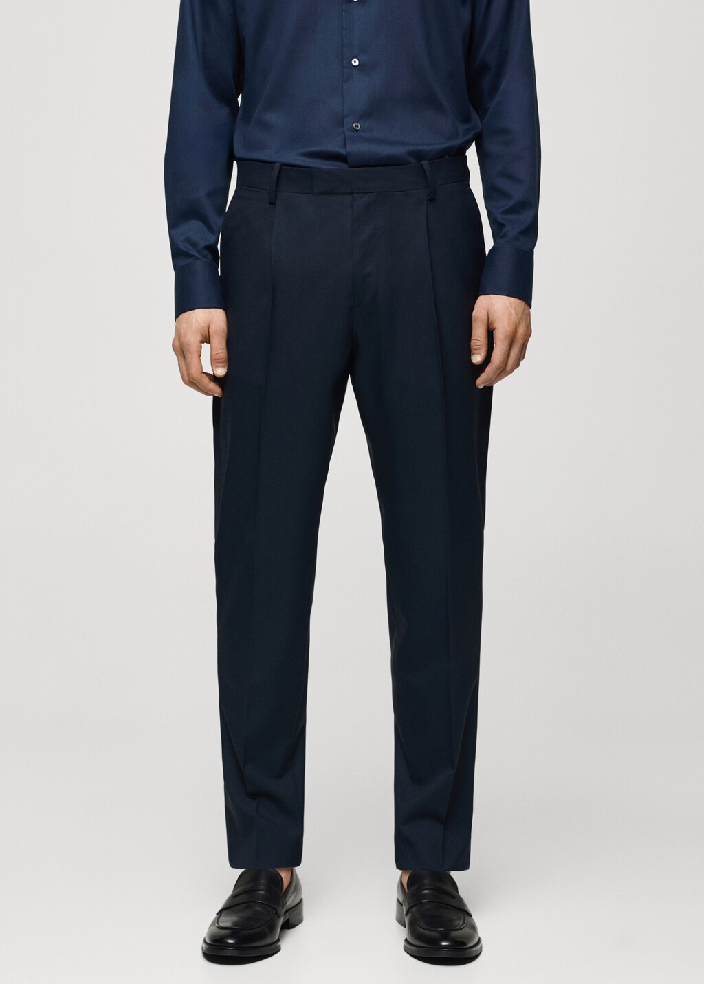100% Italian virgin wool fabric from Vitale Barberis, a benchmark in the world of tailoring. Designed in Italy. Made in Portugal. Slim fit. Belt loops. Front zip closure, double hook and interior button. Buttons on the inside of the waistband for shoulder straps. Front pleat detail. Two front pockets. Two welt pockets with button at the back. Ironed stripe detail at front and back.