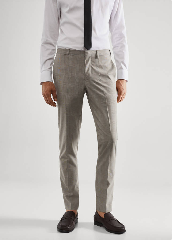 Super slim fit. Fabric made of recycled polyester, a durable, breathable, easy-care fibre that provides comfort in use. Comfort Stretch: Stretch fabric for added comfort. Prince of Wales check print. Detail of front and rear calipers. Concealed button, hook and zip fastening. Belt loops. Two side pockets. Coin pocket at hip height. Two welt pockets with button at the back. Tailoring collection. Comfort: Horizontal and vertical stretch fabric for added comfort