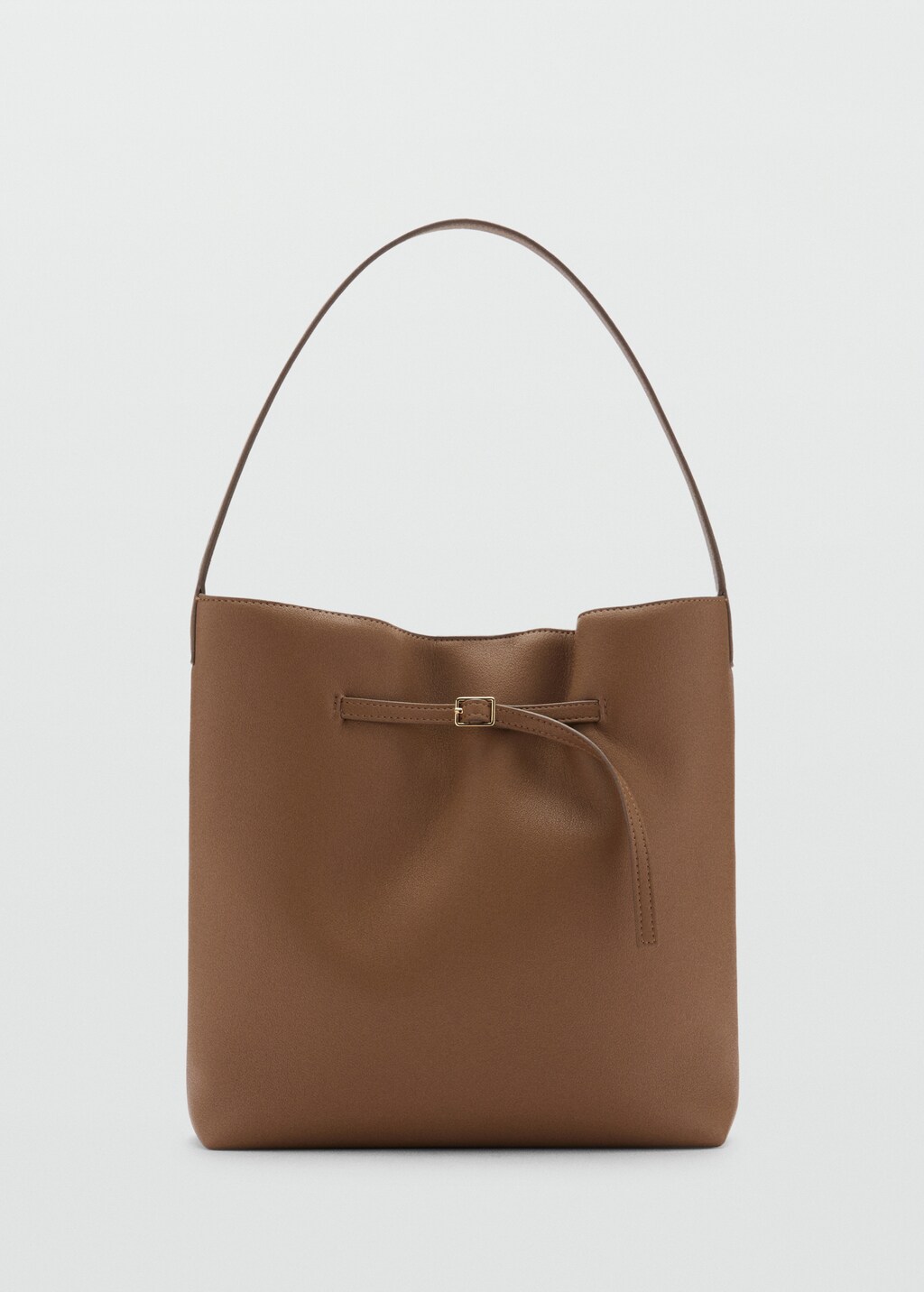 Faux leather. Medium. Bucket design. Shoulder strap. Magnetic metallic fastening. Decorative buckle.