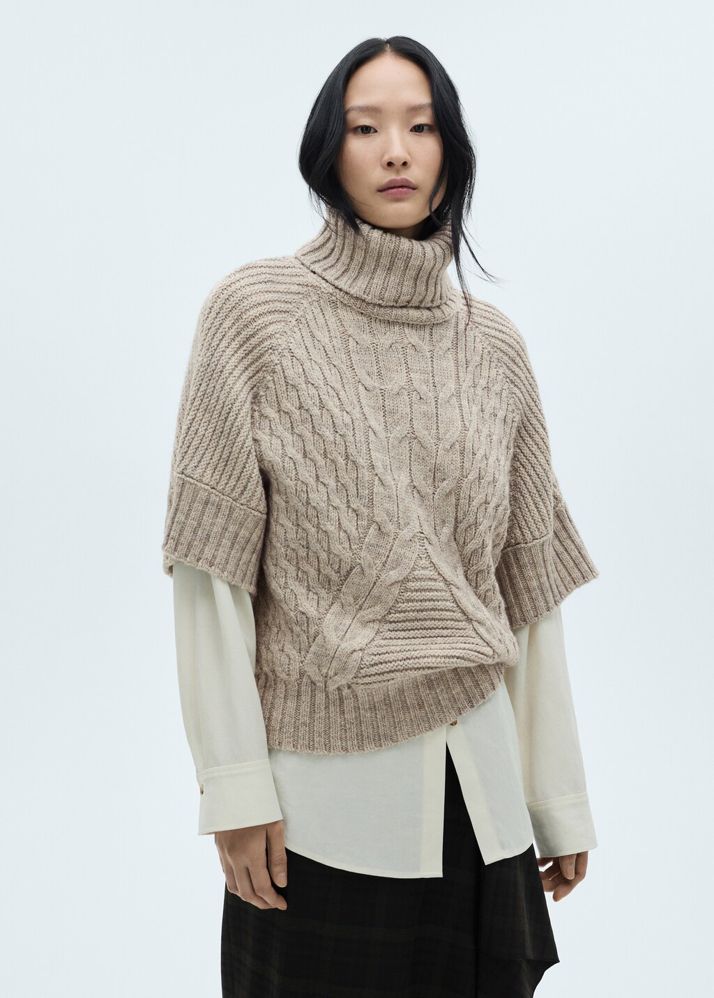 Chunky knit fabric. Chunky cable knit. Straight design. Roll neck. Short sleeves. Ribbed finishes. No Fastening.