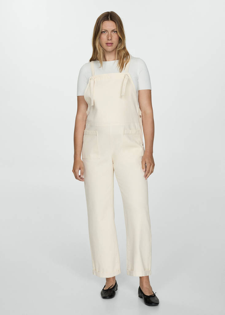 Denim-style cotton fabric. Long design. Straight design. Straight collar. Sleeveless. Crossover straps on the back. Two side patch pockets. Two patch pockets at the back. Side button fastening. Inseam 68 cm. We recommend you buy your usual size. Provides comfort and freedom of movement. Maternity