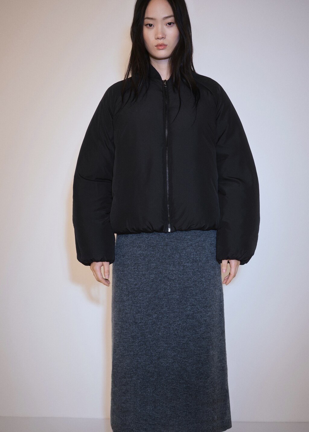 Bomber design. High neck. Oversize design. Hem with elastic band. Two side pockets. Zip fastening on the front section. Inner lining. Long sleeves with elastic cuffs.