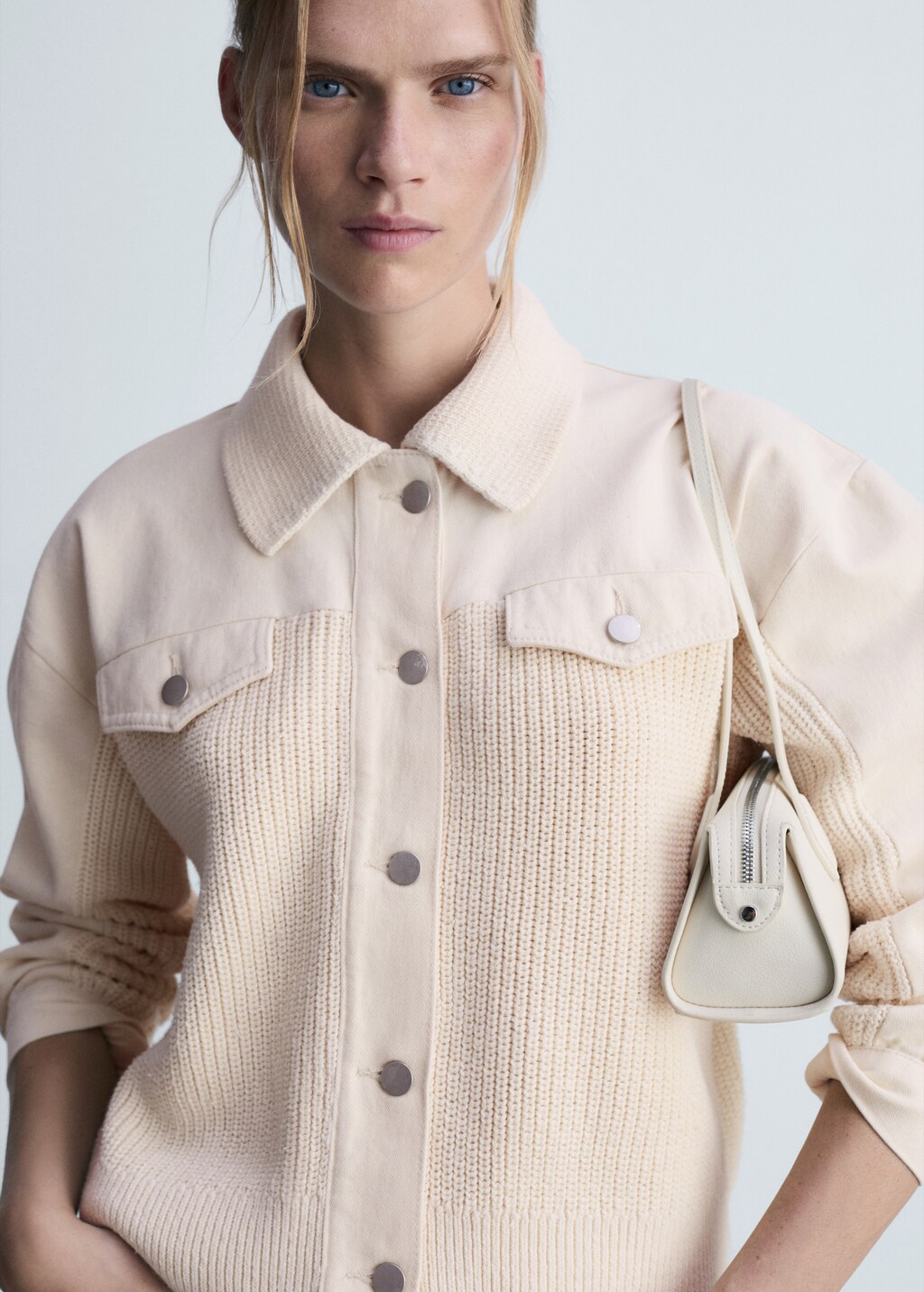 Knit fabric. Straight design. Combined design. Shirt collar. Long sleeves. Two front welt pockets. Button fastening at the front.