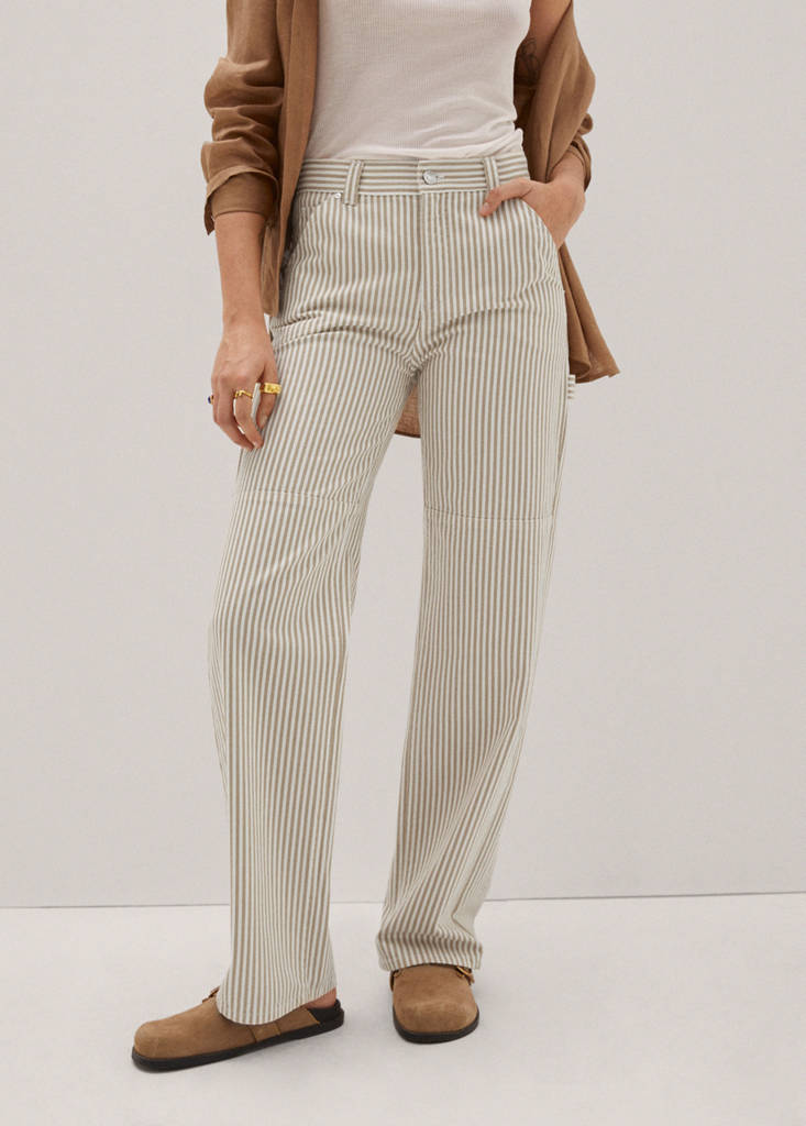 Denim style cotton fabric. Straight design. Long design. Medium waist. Decorative seams. Five pockets. Two cargo pockets. Loops. Zip and one button fastening. Fits bigger to size. Inseam 80 cm
