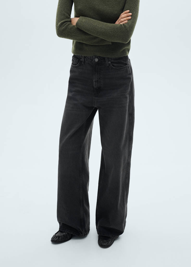 Denim-style cotton fabric. High waist. Balloon Design. Long design. Straight design. Five pockets. Belt loops. Front zip and button closure