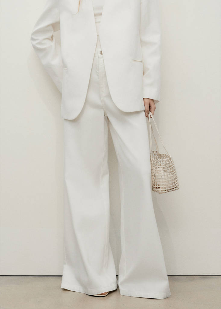 Denim-style cotton fabric. Wide-leg design. Long design. Full length. High waist. Belt loops. Five pockets. Front zipper and button closure