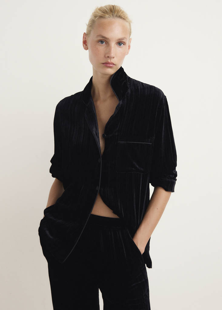 Silk fabric. Shirt-style V-neck collar. Button up. Soft touch. Velvet fabric. Straight design. Coordinates with more products from the collection