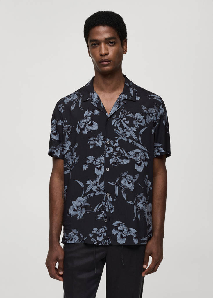 Lágy anyag. Hawaii minta. Bowling gallér. Gombos záródás elöl. Rövid ujjú. Egyenes szegély