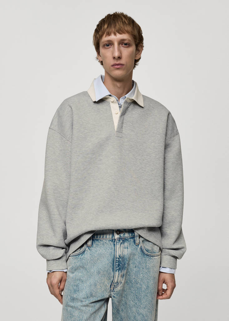 Relaxed fit. Újrahasznosított szövet. Rugalmas mandzsetta. Egyenes szegély. Gombos kontrasztos pólógallér