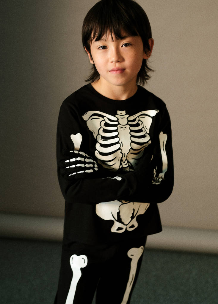 Halloween kollekció. Póló és pizsama nadrág szett. Sötétben csillogó dizájn. 100% Pamut. Egyenes kialakítás. Rugalmas derék. Kerek nyakkivágás. Hosszú ujj. Zárás nélküli