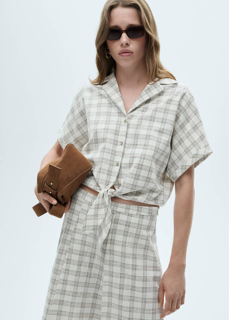 Crop dizájn. Egyenes kialakítás. Kockás dizájn. Galléros nyak. Rövid ujjú. Masnis záródás. Total look. Elülső gombos záródás. 100% pamut szövet