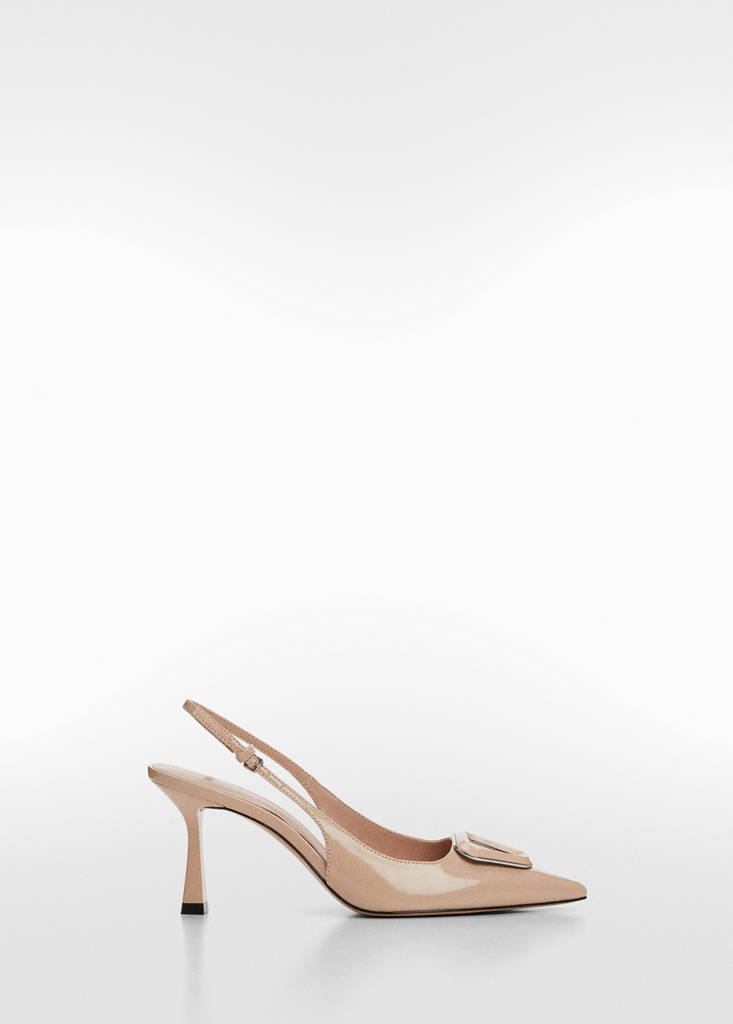 Lakkos hatás. Tűsarok. Hegyes. Sarok nélkül. Csatos záródás. Fémes részlet. A sarok magassága 7,5 cm. Magas sarok