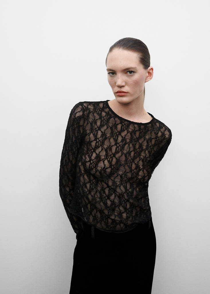 Csipke anyag. Rugalmas anyag. Egyenes kialakítás. Kerek nyakkivágás. Hosszú ujj. Zárás nélküli