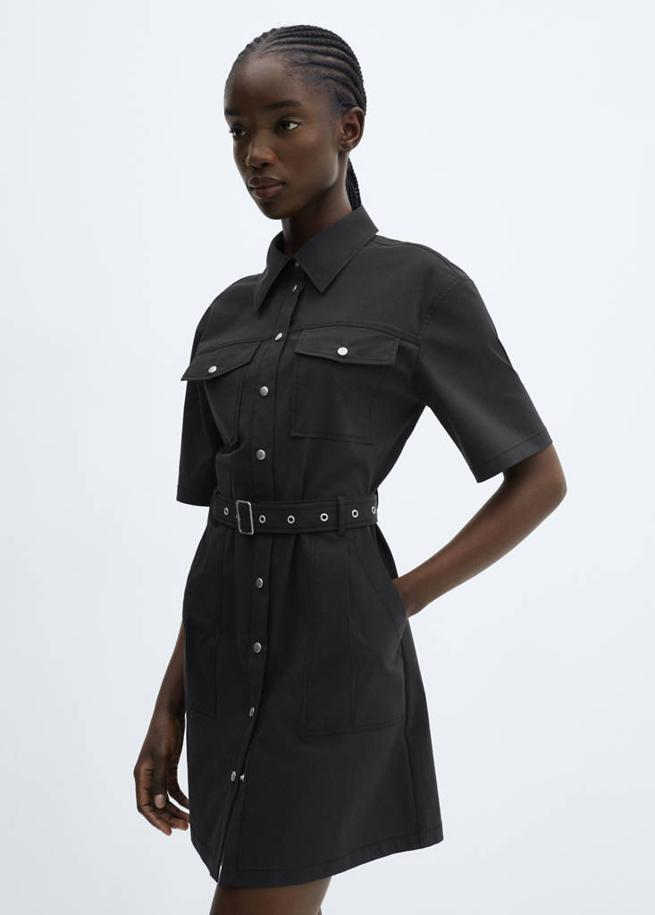 Pamutkeverék szövet. Rövid dizájn. Egyenes kialakítás. Galléros nyak. Rövid ujjú. Övbújtatók. Két, hajtókával ellátott, gombos szivarzseb. Két oldalsó zseb. Elülső cipzár és nyomásra zárható gombok. Levehető öv