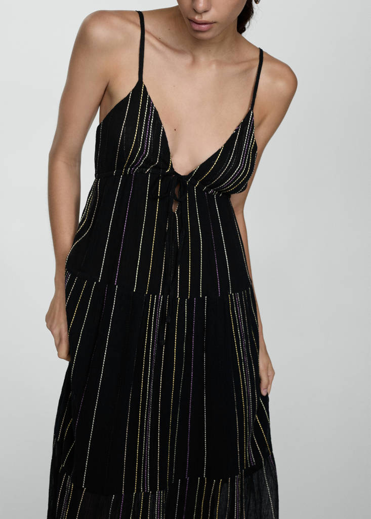 Pamutkeverék szövet. Hosszú dizájn. Maxi fazon. Egyenes kialakítás. V-kivágás. Ujjatlan. Vékony pántok. Masnis dekoltázs. Zárás nélküli. Dekoratív varratok