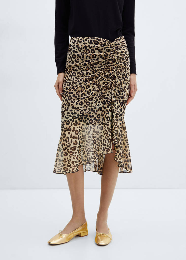 Lágy anyag. Aszimmetrikus dizájn. Leopárd mintás. Nyomtatott állatos mintás. Láthatatlan cipzár az oldalán. Fodros szegély. Ráncolt részlettel. Belső bélés. Ünnepi, ceremónia és elsőáldozási kollekció