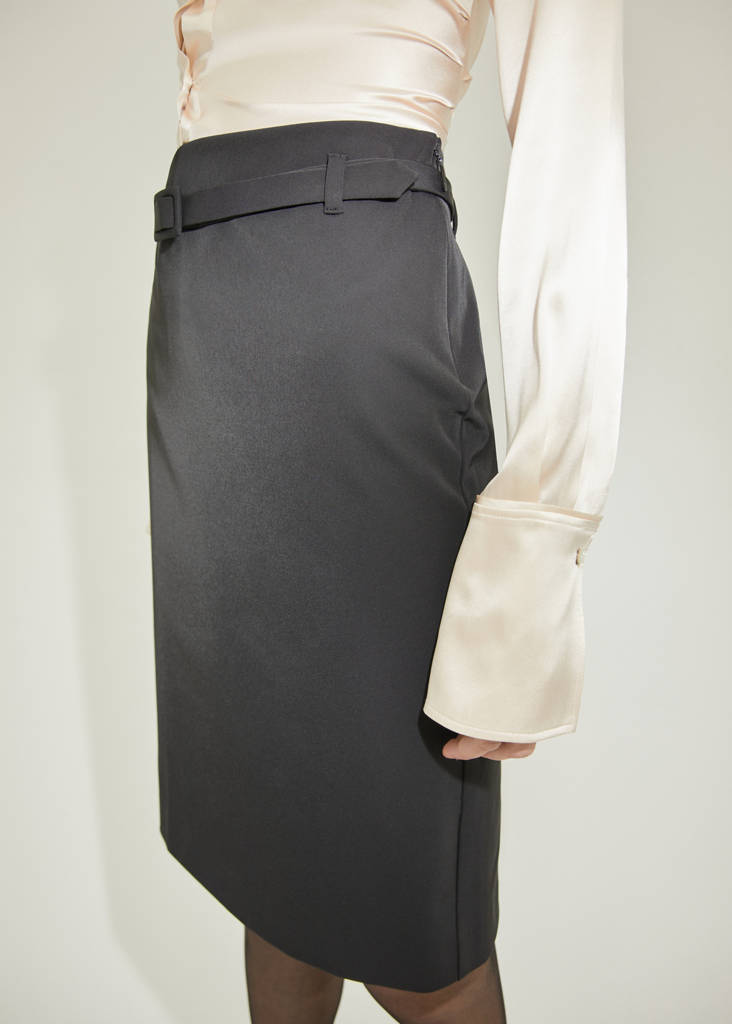 Lágy anyag. Ceruza modell. Midi fazon. Közepes derékmagasság. Oldalsó záródás. Hátsó részen nyílás. Dekoratív öv. Selection kollekció