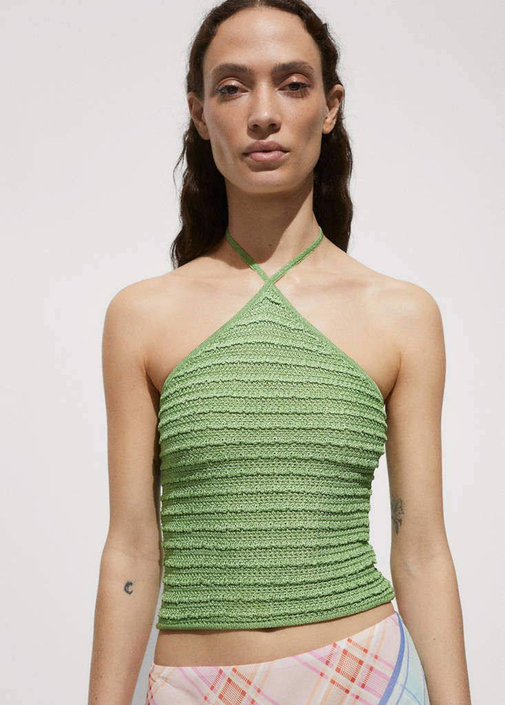 Középpontos. Kötött anyag. Lurex szövet. Crop dizájn. Halter nyak. Ujjatlan. Vékony pántok. Masnis rögzítéssel a nyak részen. Karcsúsított dizájn