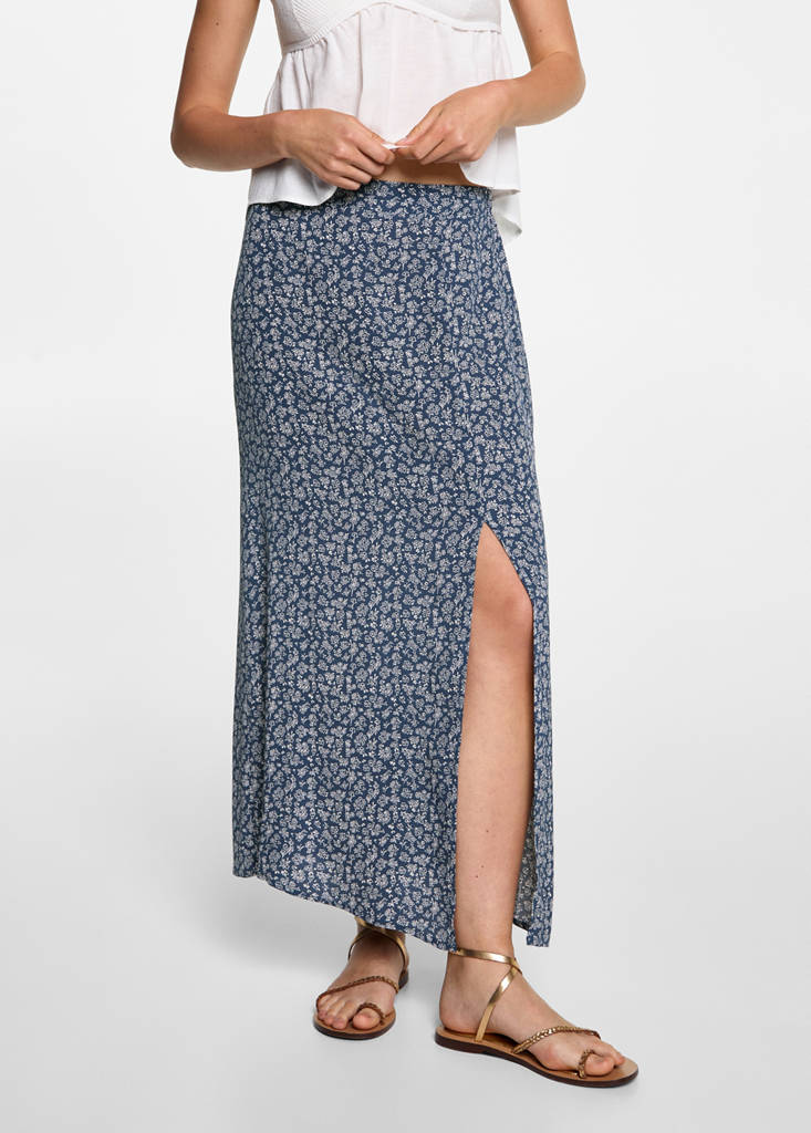 Virágmintás. Egyenes kialakítás. Midi fazon. Rugalmas derék. Oldalt sliccelt. Zárás nélküli. Nyomott minta. Viszkóz anyag