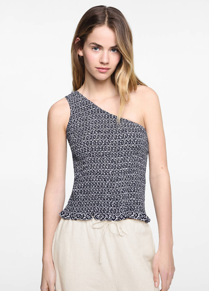 Aszimmetrikus dizájn. Crop dizájn. Nyomtatás. Aszimmetrikus nyakvonal. Ujjatlan. Viszkóz anyag
