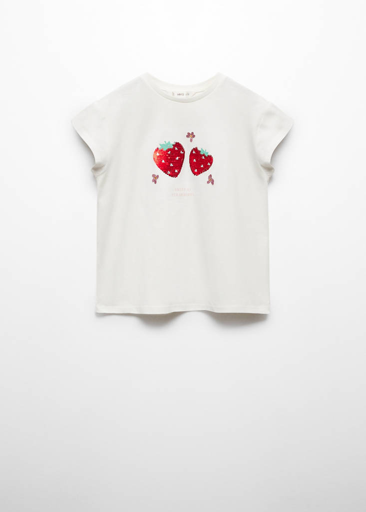100% cotone. Design diritto. Stampa fragole. Decorazione di paillettes. Collo stondato. Maniche corte