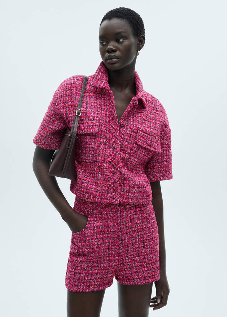 Tessuto tweed. Design oversize. Maniche corte. Due tasche a toppa con falda sul lato anteriore. Chiusura con bottoni sul davanti. Colletto a camicia. Total look