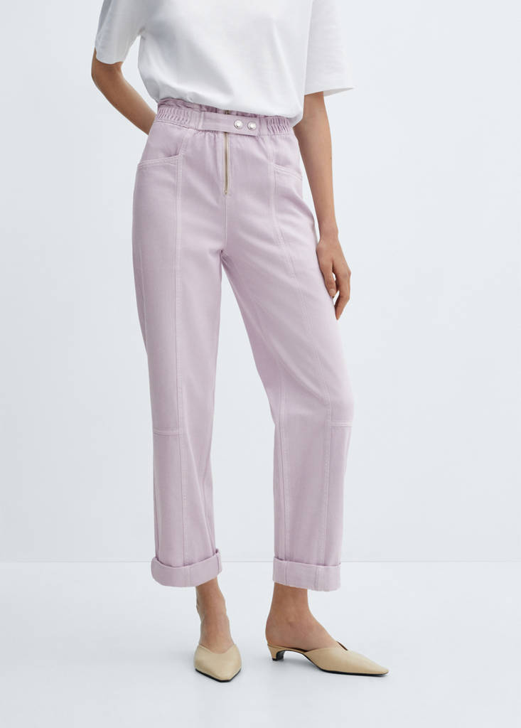 Tessuto di cotone stile denim cowboy. Design crop. Vita alta. Fit slouchy. Vita elasticizzata. Due tasche anteriori. Tasca a toppa sul lato posteriore. Chiusura con zip e bottoni a pressione. Lunghezza interna 70 cm