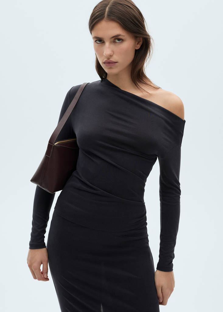 Tessuto modal-blend. Tessuto fluido. Design avvitato. Scollo asimmetrico. Manica lunga. Dettagli drappeggiati. Total look
