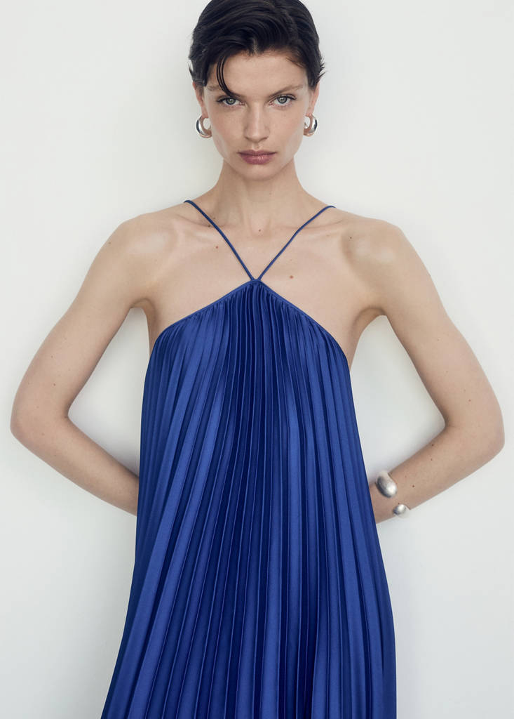 Tessuto fluido. Design midi. Design svasato. Design plissettato. Collo halter. Senza maniche. Spalline sottili. Chiusura a fiocco sul retro. Orlo asimmetrico. Dettaglio di perline. Collezione per feste, cerimonie e comunioni. Questo capo appartiene alla nostra collezione evento, progettata per farti diventare l'invitata perfetta in qualsiasi festa, matrimonio o cerimonia