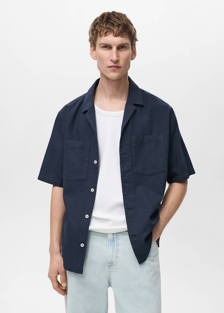Camicia a maniche corte. Tessuto strutturato 100% cotone. Colletto bowling. Due tasche sul petto. Chiusura frontale con bottoni. Orlo dritto con spacchi laterali