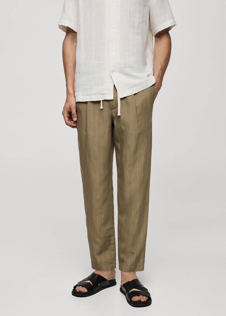 Tessuto misto lino e lyocell. Stampa a righe. Dettaglio piega frontale. Passanti per cintura. Vita elasticizzata con laccio regolabile. Due tasche anteriori. Due tasche a filetto con bottone sul retro. Chiusura anteriore con zip e bottone