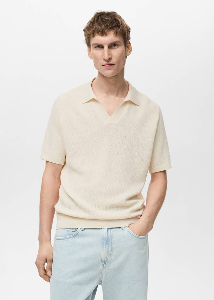 Slim fit. Tessuto di maglia sottile. Collo polo senza bottoni. Maniche corte. Bordi a coste su collo, maniche e orlo inferiore