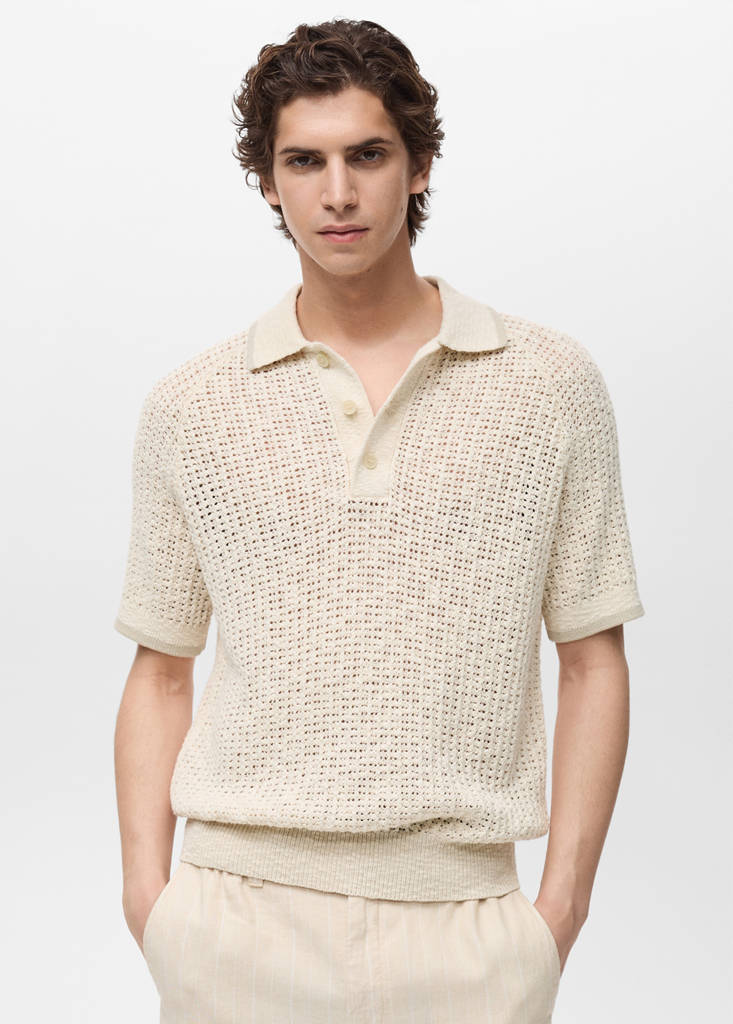 Tessuto 100% cotone. Taglio diritto. Maglia traforata. Colletto polo con chiusura a bottoni. Collo, maniche e bordo inferiore a coste